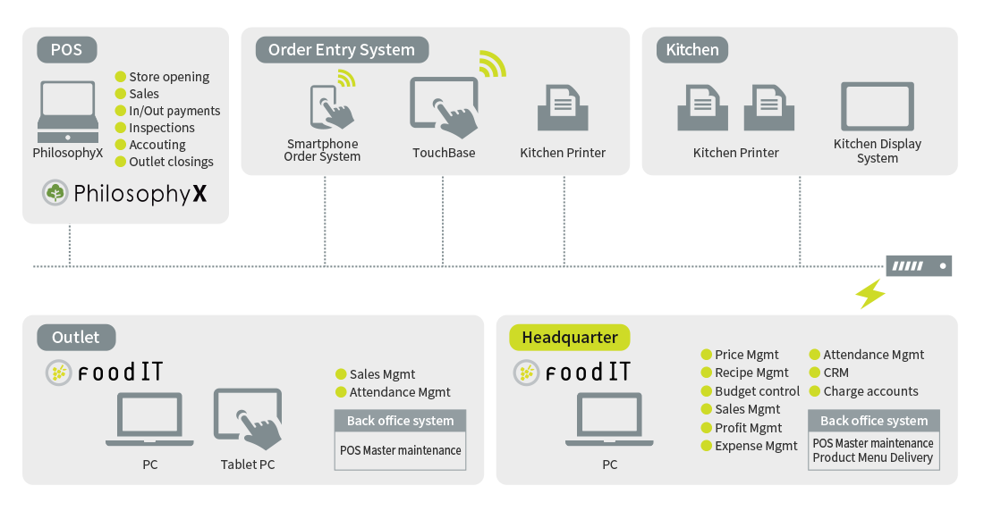 POS functions: Outlet openings, sales, in/out payments, inspections, accounting, outlet closings, and time cards Back-office functions: Receipt search, sales trends, totals reports, menu ABC analysis, electronic journal downloads, manager maintenance, attendance monitoring, sales analysis, reservations, and customer services.